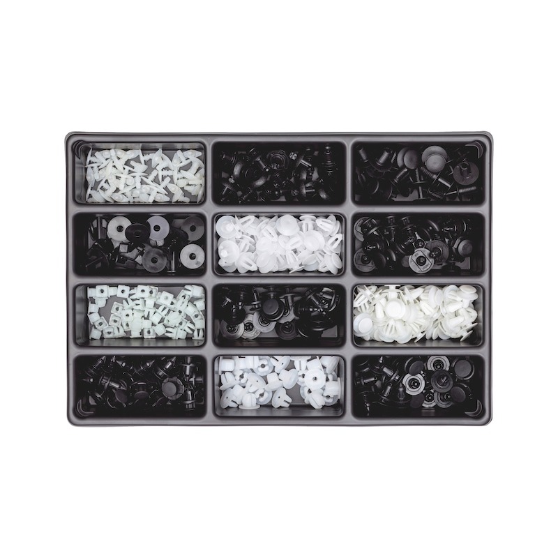 Settið inniheldur 425 festihluti fyrir vinsæl bílamerki eins og Honda, Nissan, Mitsubishi, Toyota, Lexus, Mazda og Subaru. Hentar vel fyrir viðgerðir og samsetningar á innréttingum og yfirbyggingu. Afhent án kassa, sem gerir það hentugt til notkunar með ORSY kerfum, t.d. í kerfiskössum eða verkfæraskúffum.