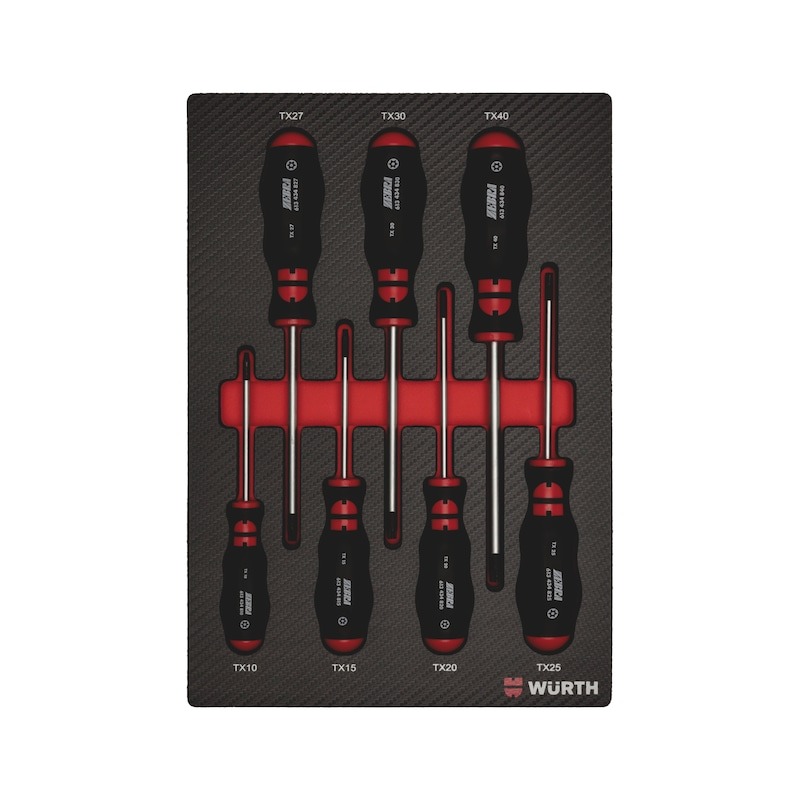 Skrúfbitasett með RW, PH, PZ, TX, SD og sexkantabitum ásamt bitahaldara. Fjölhæft og skipulagt með færanlegum bitaröðum.